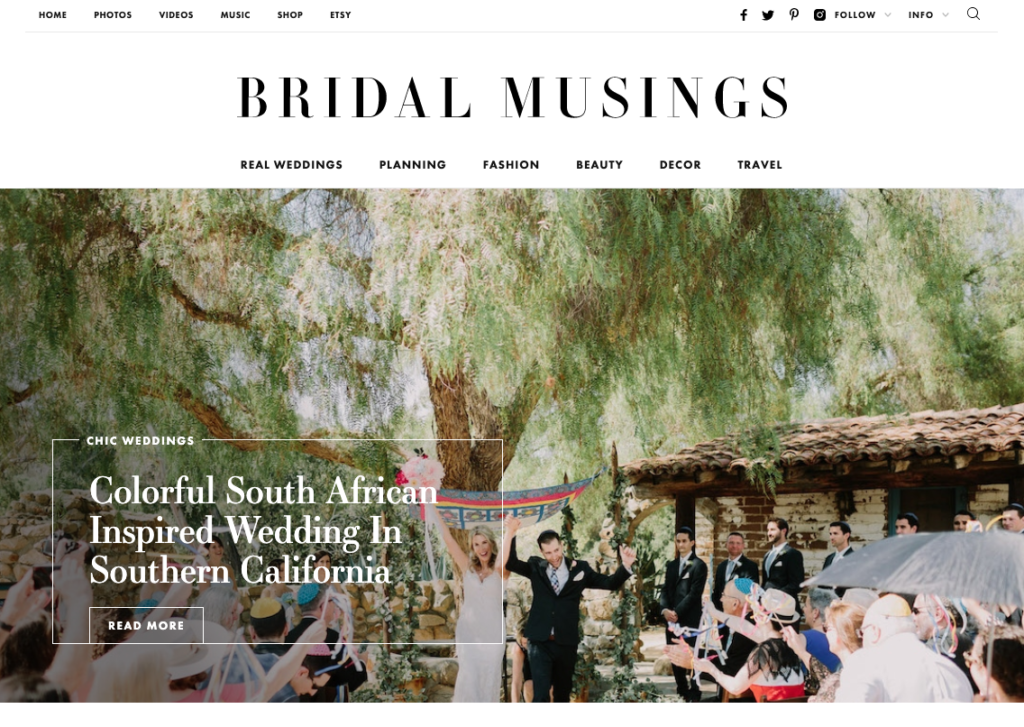 Real weddings, event planning, fashion, beauty, decor, and travel—these are what Bridal Musings have to offer romance seekers. Weddings, proposals, honeymoons, oh my!