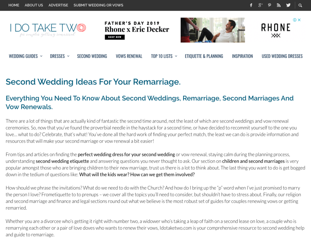 I Do Take Two is a team that specializes in second weddings. Whether you are renewing your vows or a divorced or separated couple trying to get it right the second time around, you’ll love this guide on doing the second “I Do” just right.